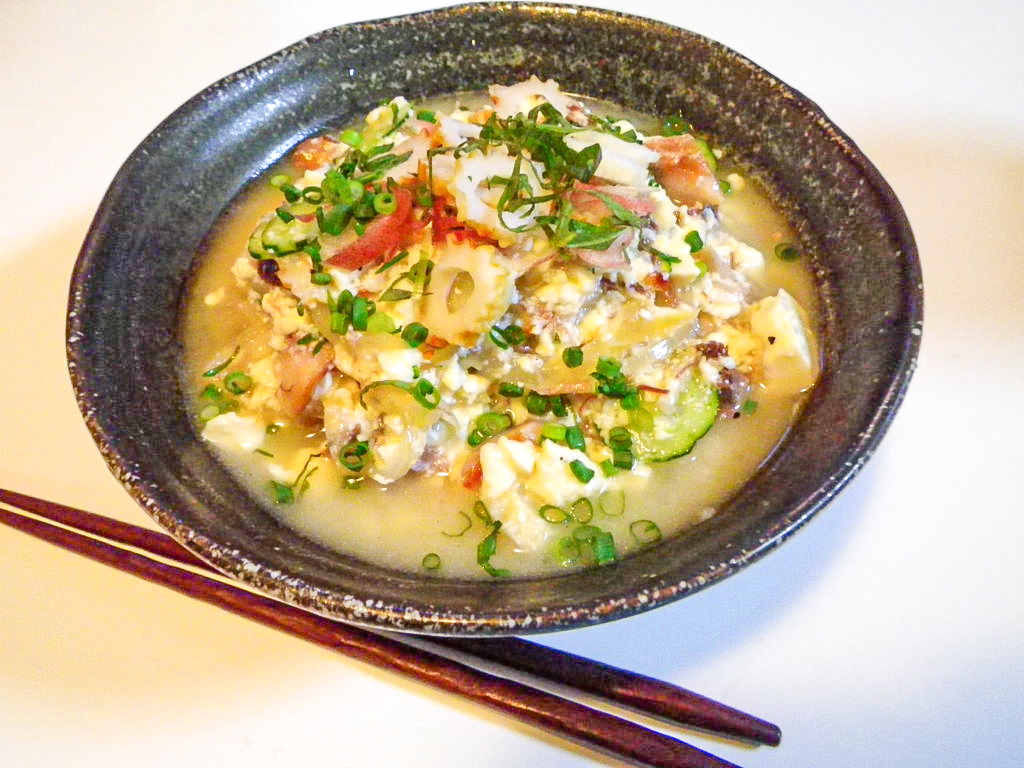 アジの干物…2枚、きゅうり…1本、塩…小さじ1、豆腐…1/2丁、みょうが…1個、だし汁…2カップ、味噌…大さじ2、